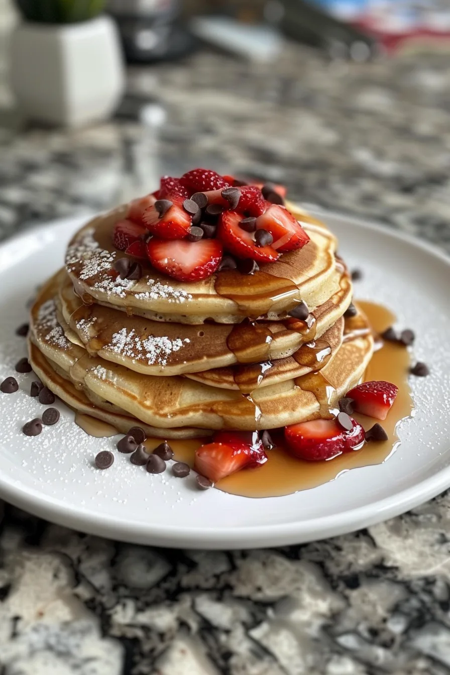 Preparation is straightforward, with a few simple steps that yield a deliciously fluffy stack of pancakes that are perfect for any morning. The blend of juicy strawberries and melty chocolate chips adds a burst of flavor in each bite, making these pancakes not just a breakfast but a delightful treat.
