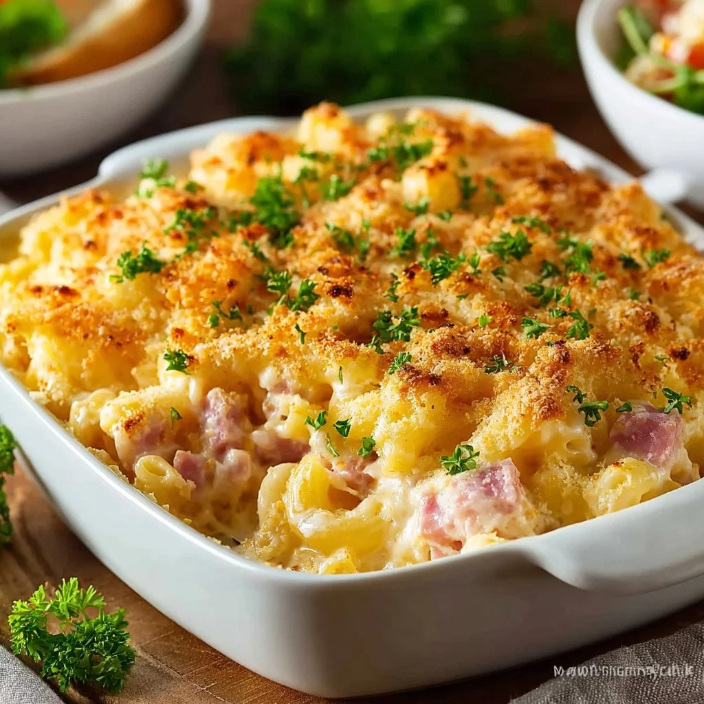 You build the casserole in a 9×13 dish. First layer the chicken, then ham, then Swiss cheese. Make a white sauce with butter, mustard, milk, and spices. Pour the sauce over the cheese and top with buttery Panko crumbs. Bake until bubbling and golden.
