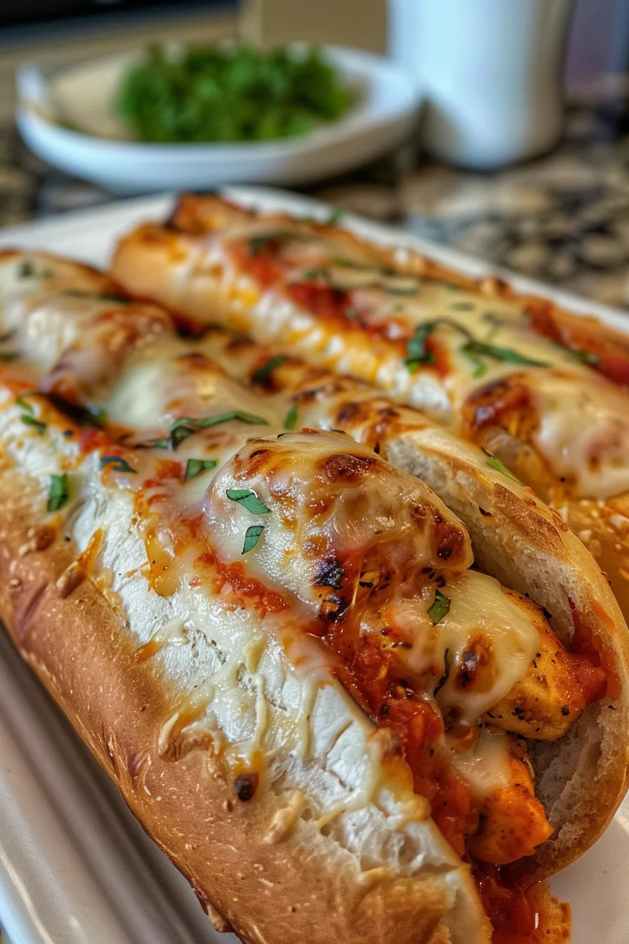 - Assemble the subs: Once the cheese is melted, carefully place each chicken piece into the sub rolls. Spoon extra marinara sauce on top if desired, and sprinkle with fresh basil leaves for a pop of color.