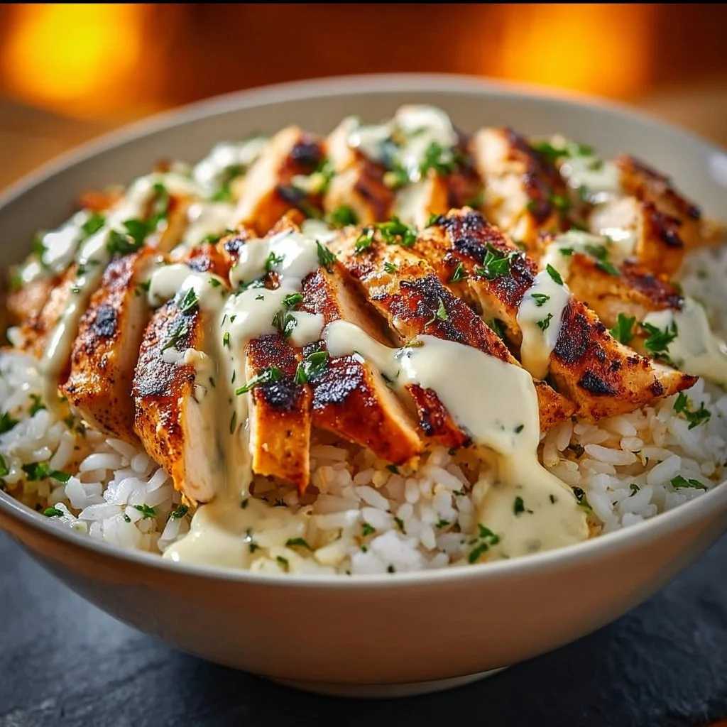 Chicken & Rice Bowls with Creamy Garlic Sauce