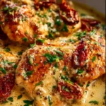 This recipe uses simple ingredients and one slow cooker. The sauce is rich with heavy cream and Parmesan. The sundried tomatoes give a sweet and tangy flavor. It pairs well with pasta, rice, or mashed potatoes. The steps are easy and the result is comforting.