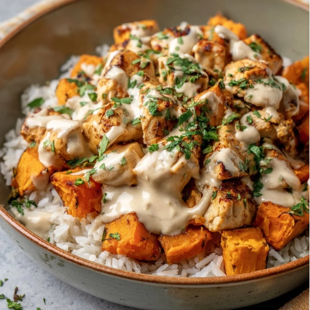 - Once everything is cooked, assemble the bowls by layering rice, roasted sweet potatoes, and sliced chicken.