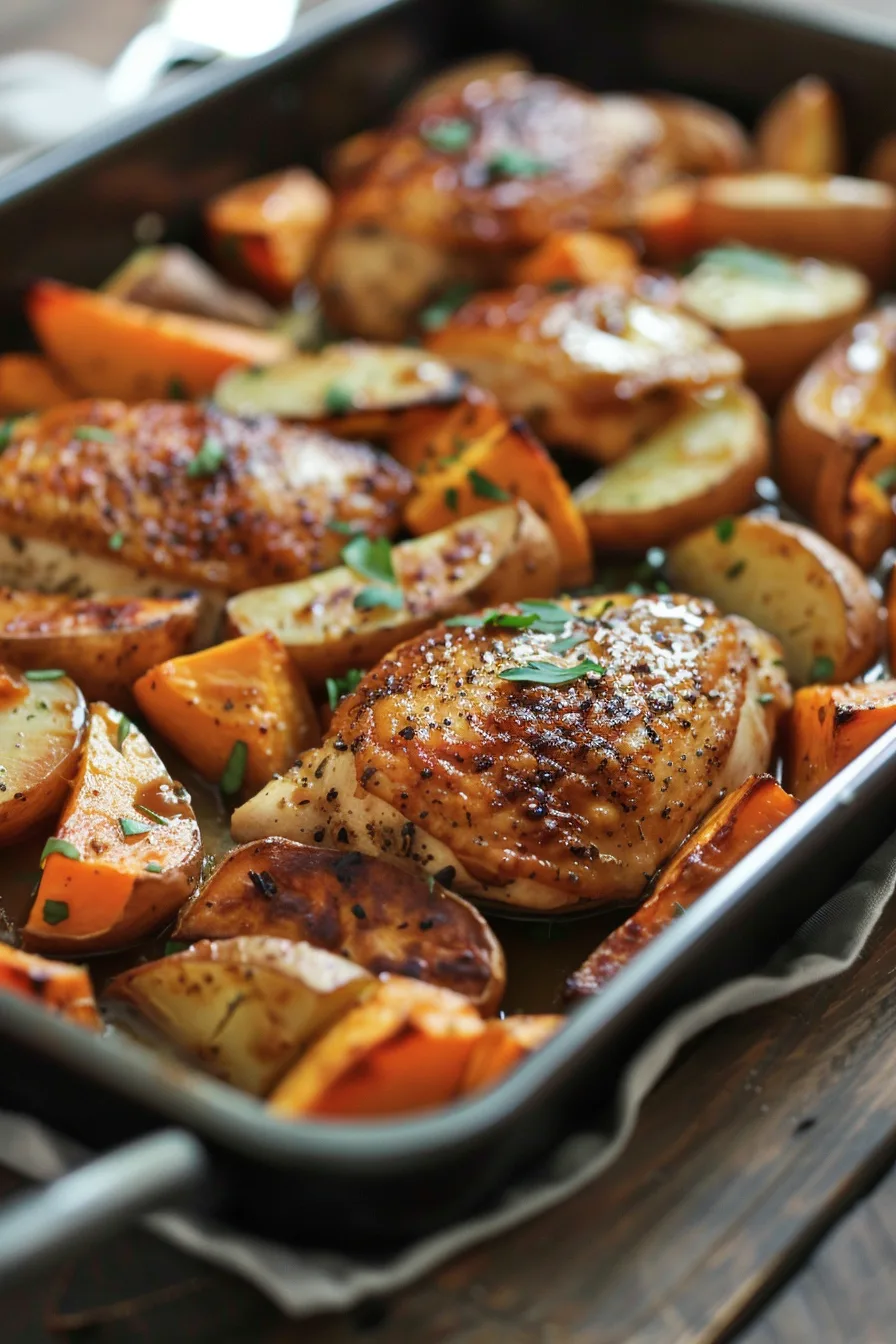 - Bake in the preheated oven for 30 minutes, or until the chicken reaches an internal temperature of 165°F (75°C) and the sweet potatoes are tender and cooked through.