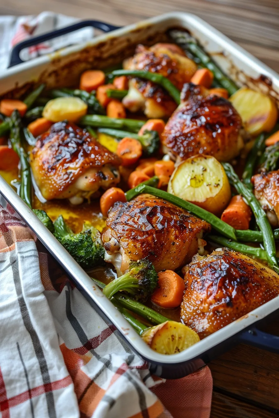 - In a baking dish, arrange the chicken thighs skin-side up. Surround the chicken with asparagus, carrots, and green beans. Drizzle any remaining honey-mustard glaze over the vegetables, ensuring they are lightly coated.