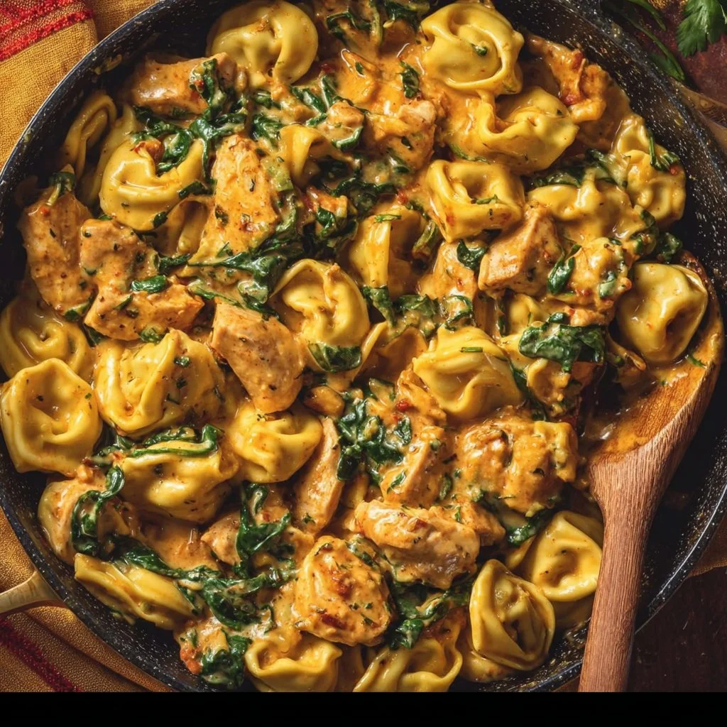 - Place the chicken, spinach, and tortellini in the skillet.