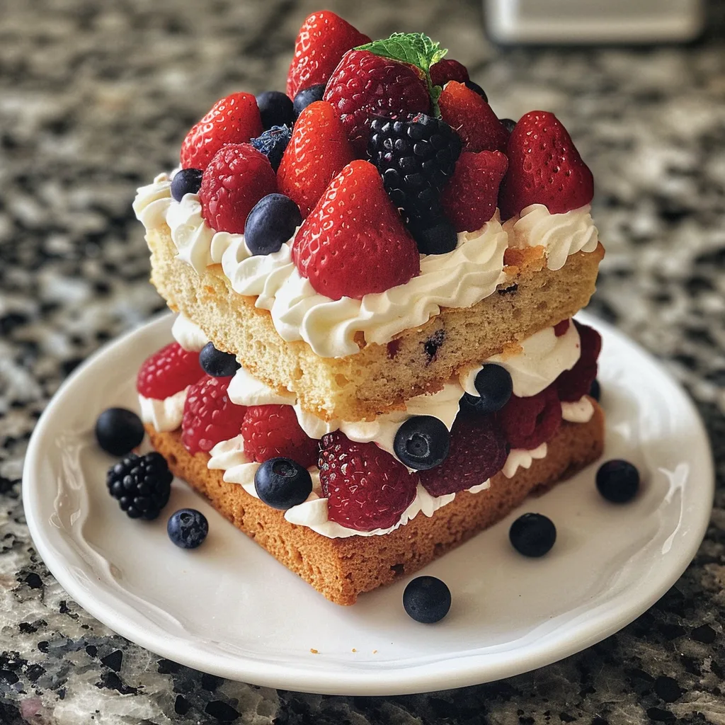 - Assemble the shortcake: Place one cake layer on a plate, top with ¼ cup berries, and some whipped cream. Repeat layers.