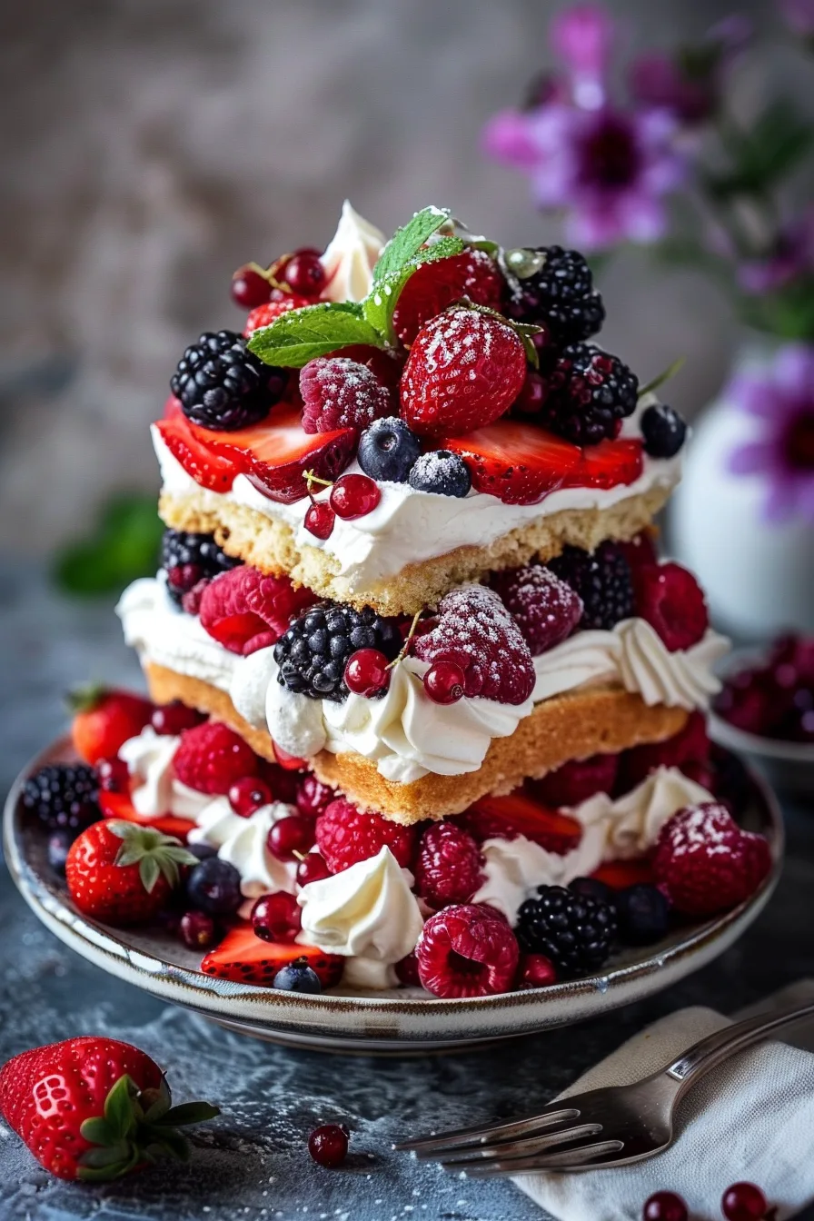 - Top with more cream and berries: Spread more whipped cream on the top layer and garnish with the remaining berries for a stunning finish.