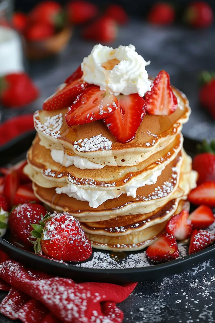 - Stack pancakes on a plate, top with strawberries and whipped cream