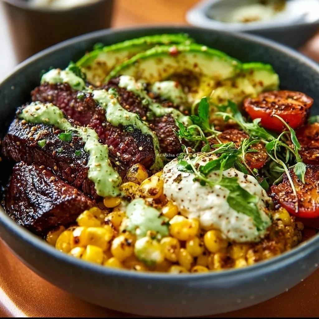 - In a bowl, layer sliced steak, avocado, and roasted corn. Drizzle with the cilantro cream sauce and serve immediately.