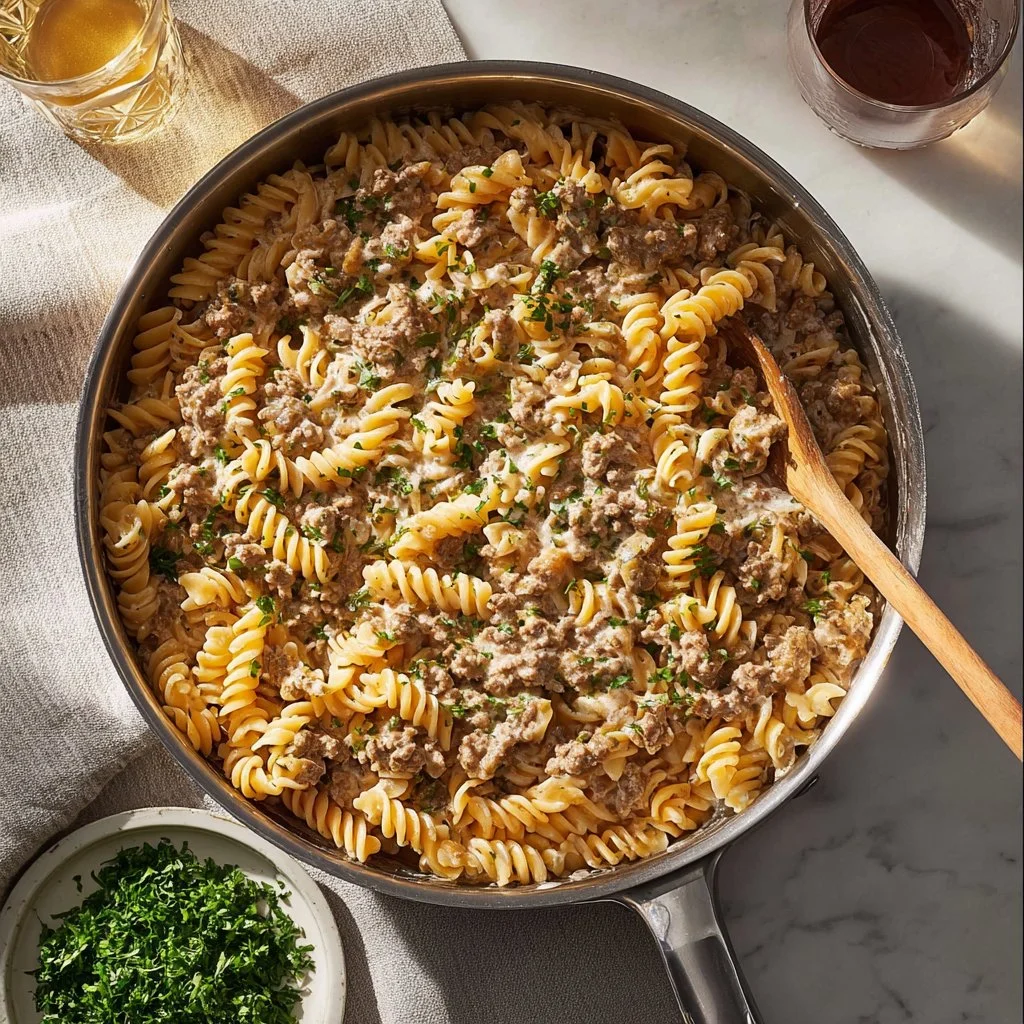 - Combine the cooked egg noodles with the beef stroganoff sauce and serve immediately.