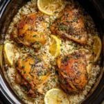 This recipe cooks chicken slowly with lemon, herbs, and garlic. The slow cooker makes the chicken very tender. You cook rice separately and serve the chicken on top. If you like easy chicken meals, this one fits well with simple sides like vegetables or a salad. You can also try it with other comfort dishes like buttered noodles for a change.