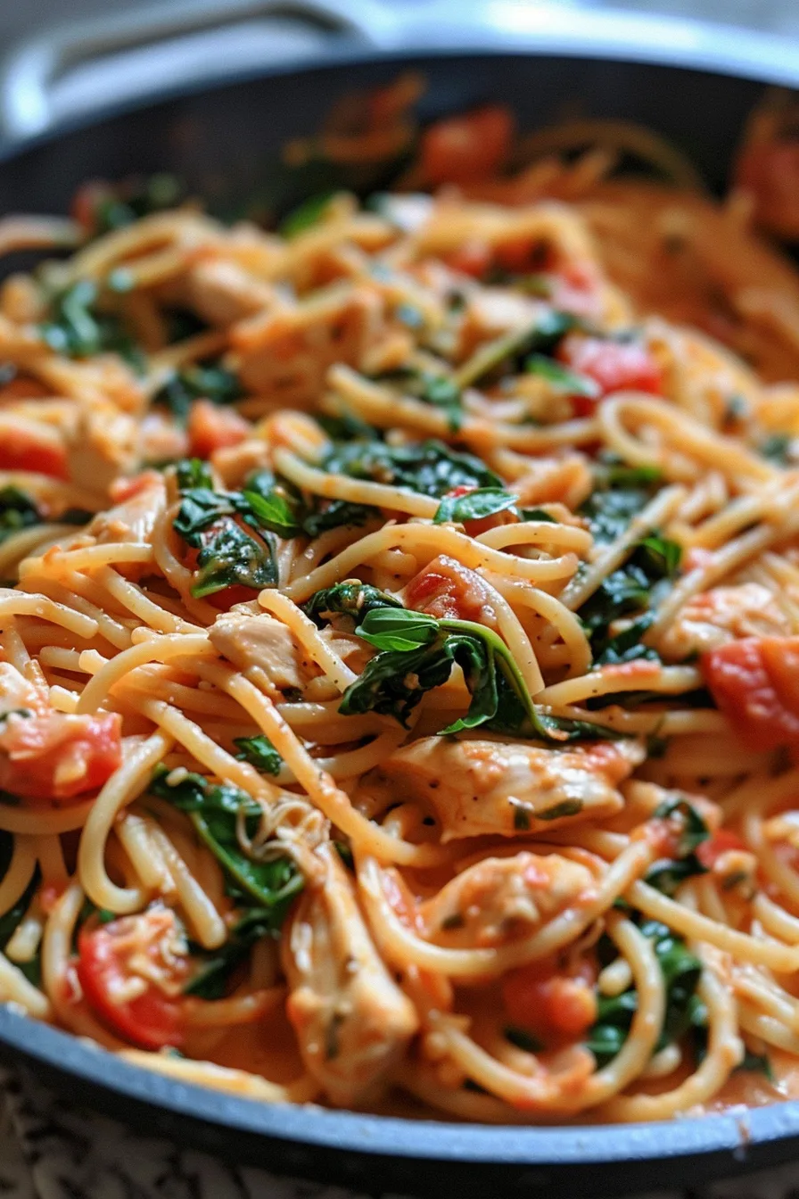 Tomato Spinach Chicken Spaghetti – Creamy, Flavor-Packed & Easy Dinner!