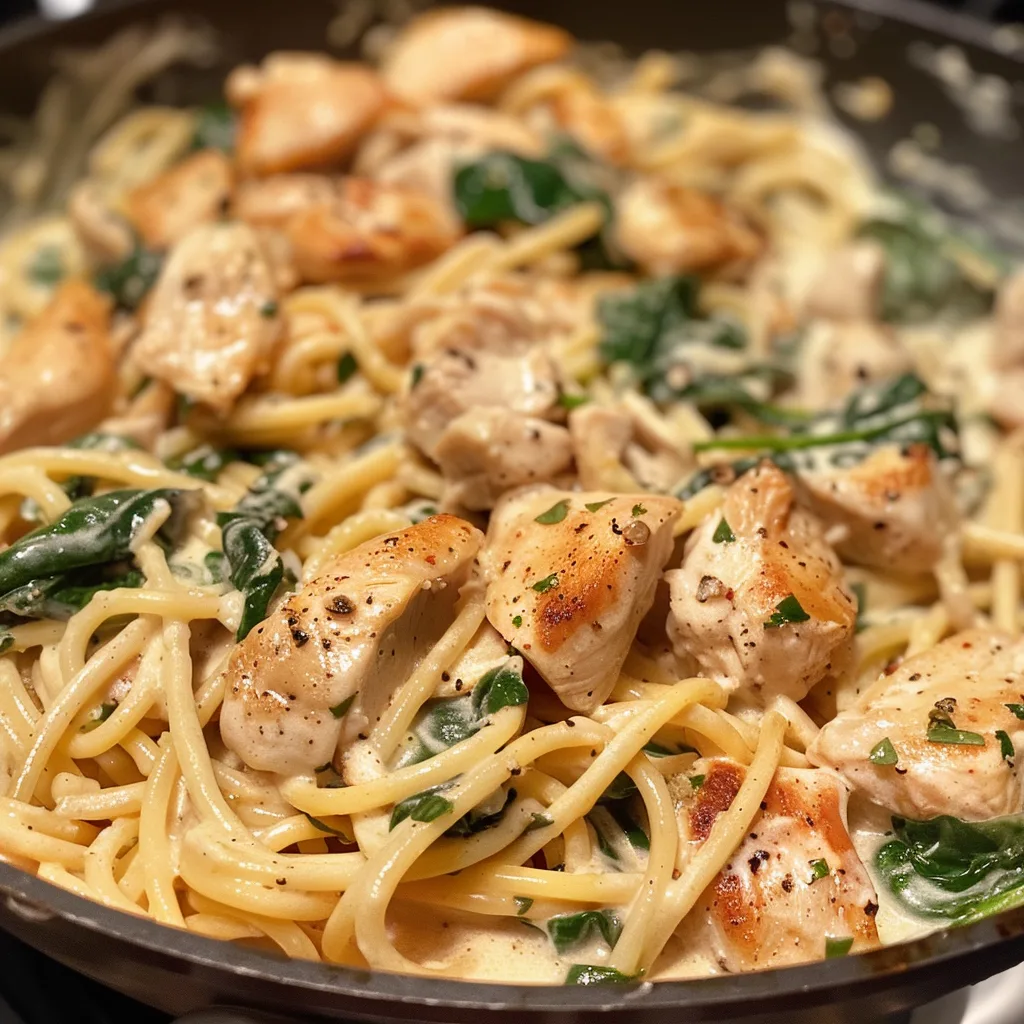 - Combine the cooked spaghetti into the skillet with the creamy chicken sauce, tossing everything together until well coated.